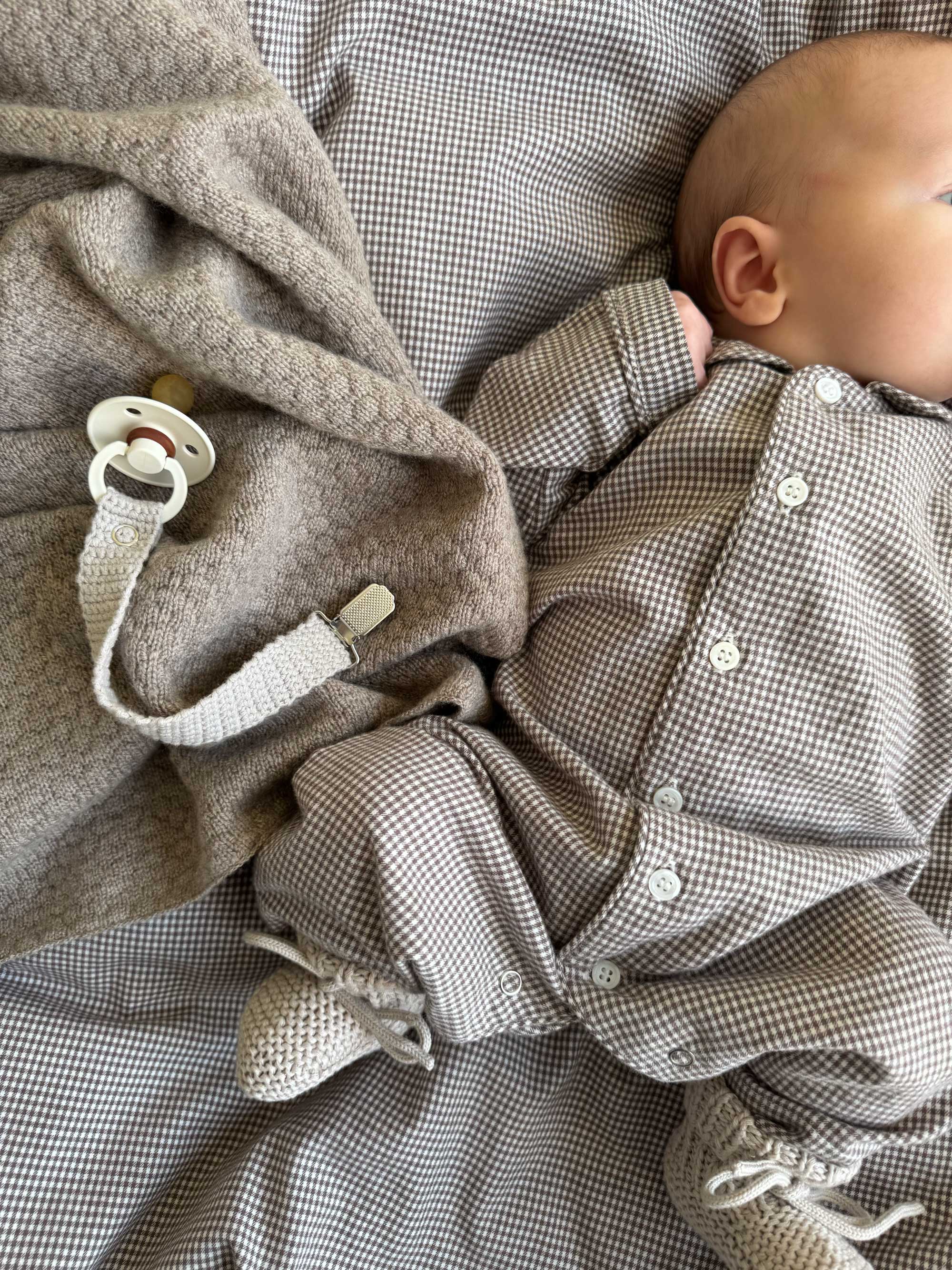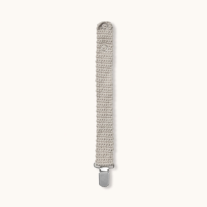 A cute crocheted pacifier clip in organic cotton. It's ideal for a secure holding on to your little one's pacifier so it won't fall onto the floor or get lost. A musthave for busy days with a baby!