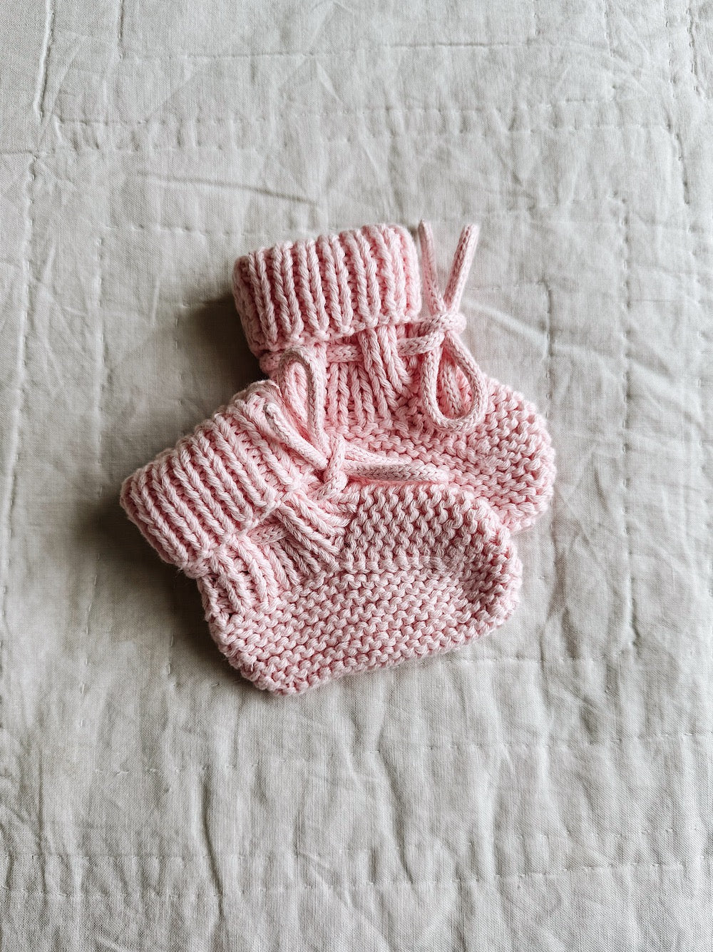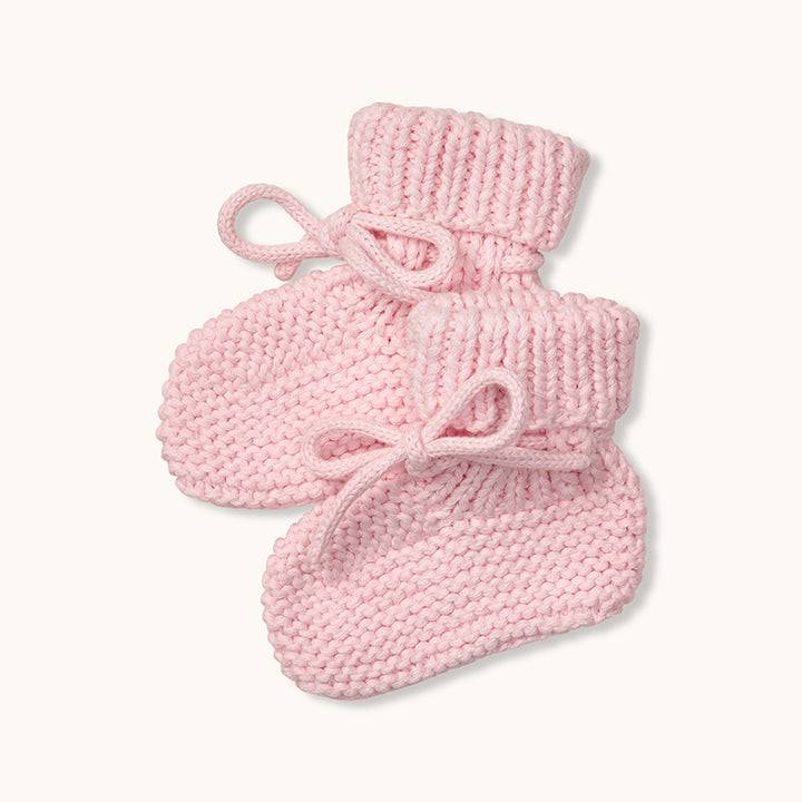 Knitted with a ribbed cuff and a soft string around the wrist, these soft little baby shoes will never come off.